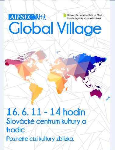 16.6. od 11 do 14 hodin bude probíhat v Café 21 multikulturní vzdělávací projekt Global Village organizace AIESEC Zlín. Na této akci stážisté z Hong Kongu, Indie, Singapuru, Číny a Taiwanu představí jídla, zvyky, kroje a jiné věci typické pro jejich kulturu. Přijďte si je poslechnout, zasoutěžit o zahraniční stáž a spoustu jiných zajímavých cen!