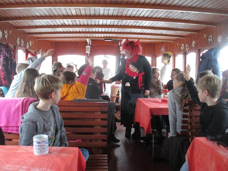 V neděli 3. prosince jsme si s dětmi ze ZUŠ Slovácko a jejich paní učitelkou zajeli ke všem čertům! Na lodi Noe, která kotví v hradišťském přístavu, nás přivítali čerti a hlavní čertice nám celou cestu zpříjemnila veselými písničkami, koledami a lahodným punčem. Do podpalubí k nám přišel i Mikuláš s anděly, kteří děti obdarovali sladkostmi za písničky, básničky a výjmenovaná slova po B. Prohlédli jsme si, jak vypadá "naše" pomalovaná stěna z vodní hladiny.