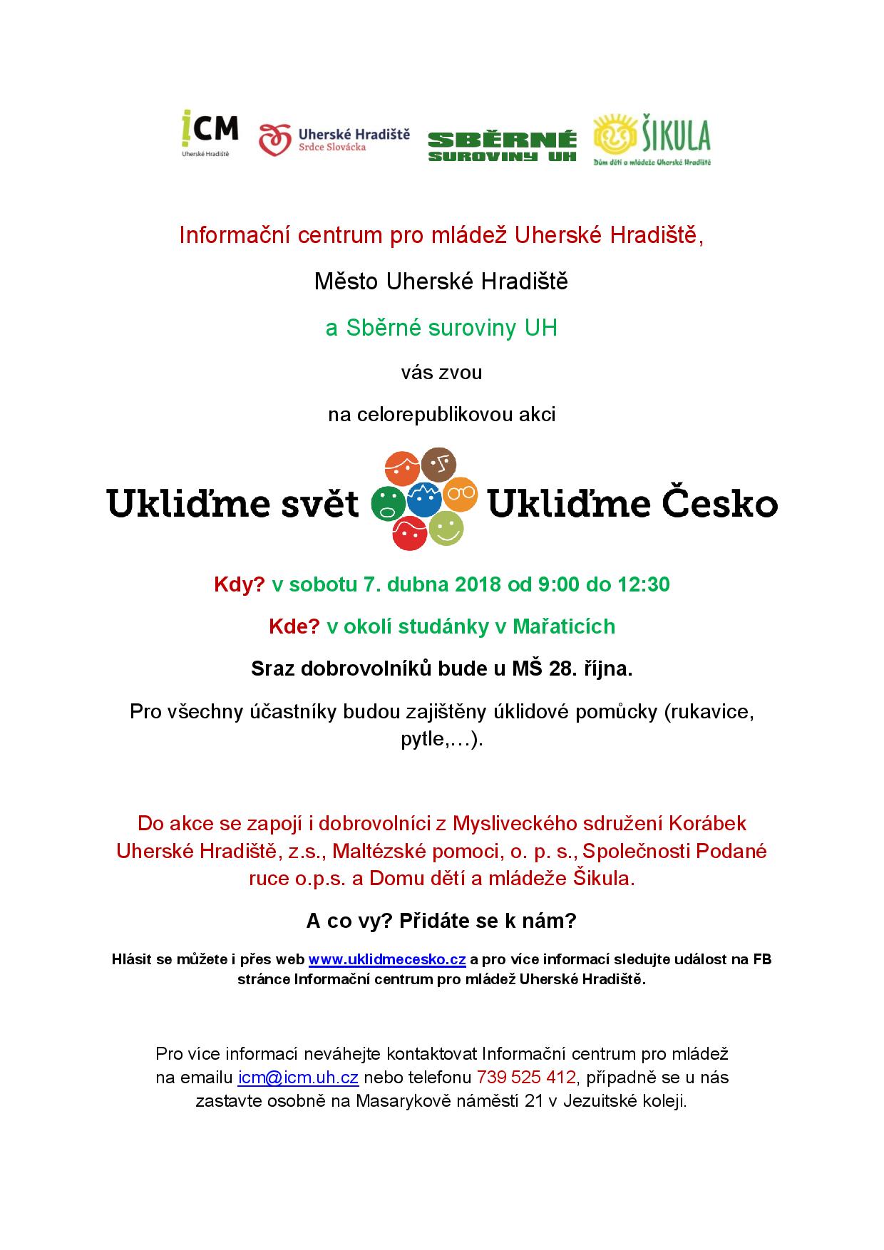 Informační centrum pro mládež Uherské Hradiště ve spolupráci s Městem Uherské Hradiště a Sběrnými surovinami UH se letos opět zapojili do akce Ukliďme svět, ukliďme Česko, jehož cílem je společně uklidit nelegálně vzniklé černé skládky během jednoho dne. Lokalitou pro úklid bylo stejně jako v loňském roce okolí studánky v Mařaticích na ulici 28. října.