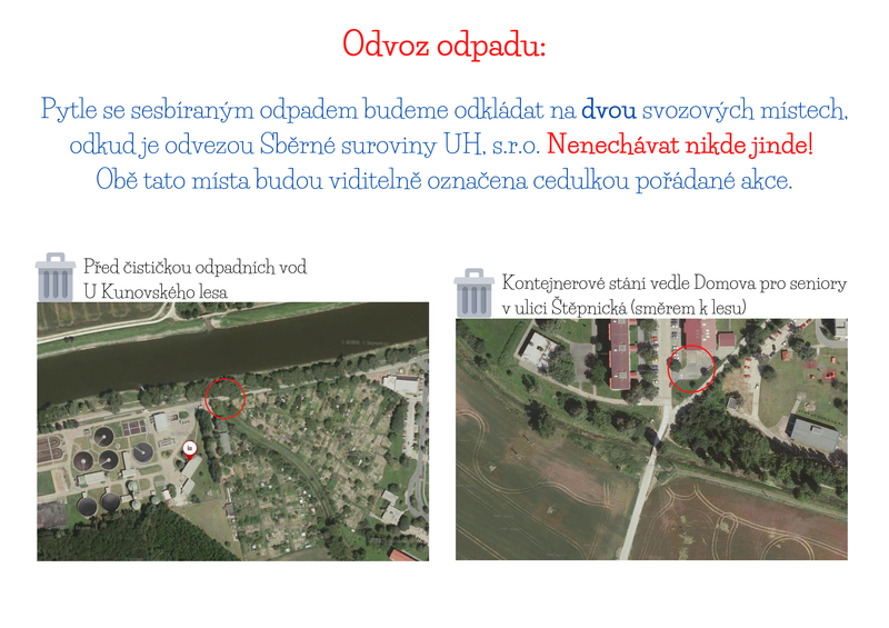 Každá úklidová lokalita bude mít dvě vyhrazená místa na sesbíraný odpad, odkud bude ještě ten den odvezen a roztřízen (viz mapka odvozu odpadu - níže).